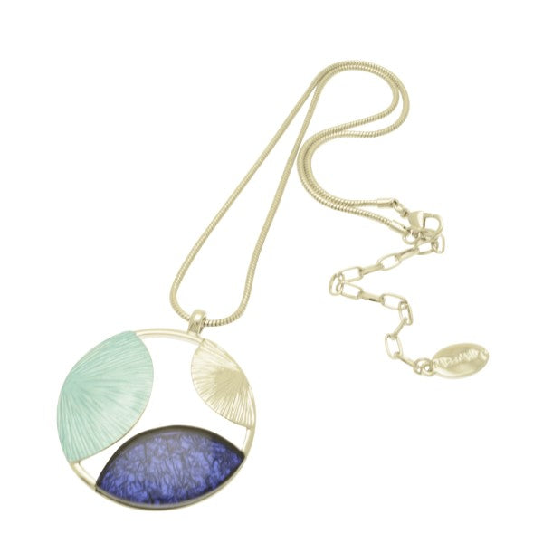 Ellipses of mid blue resin, handpainted turquoise and shiny silver sit within a circular pendant of approximately 5cm diameter. The pendant hangs from a 41cm/16″ snake chain with 8cm extender.
