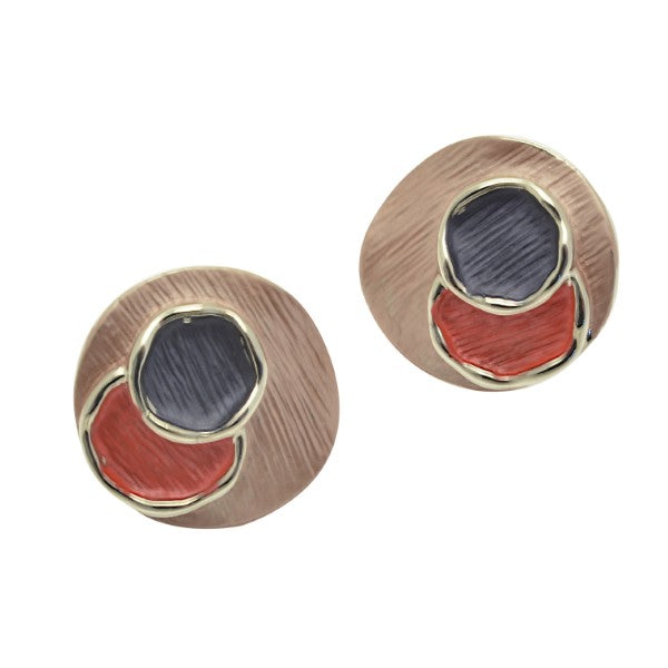 A stylish pair of coral and blue handpainted earrings that measure approximately 1.2cm in diameter. The earrings are held in place with posts and silicon stoppers.